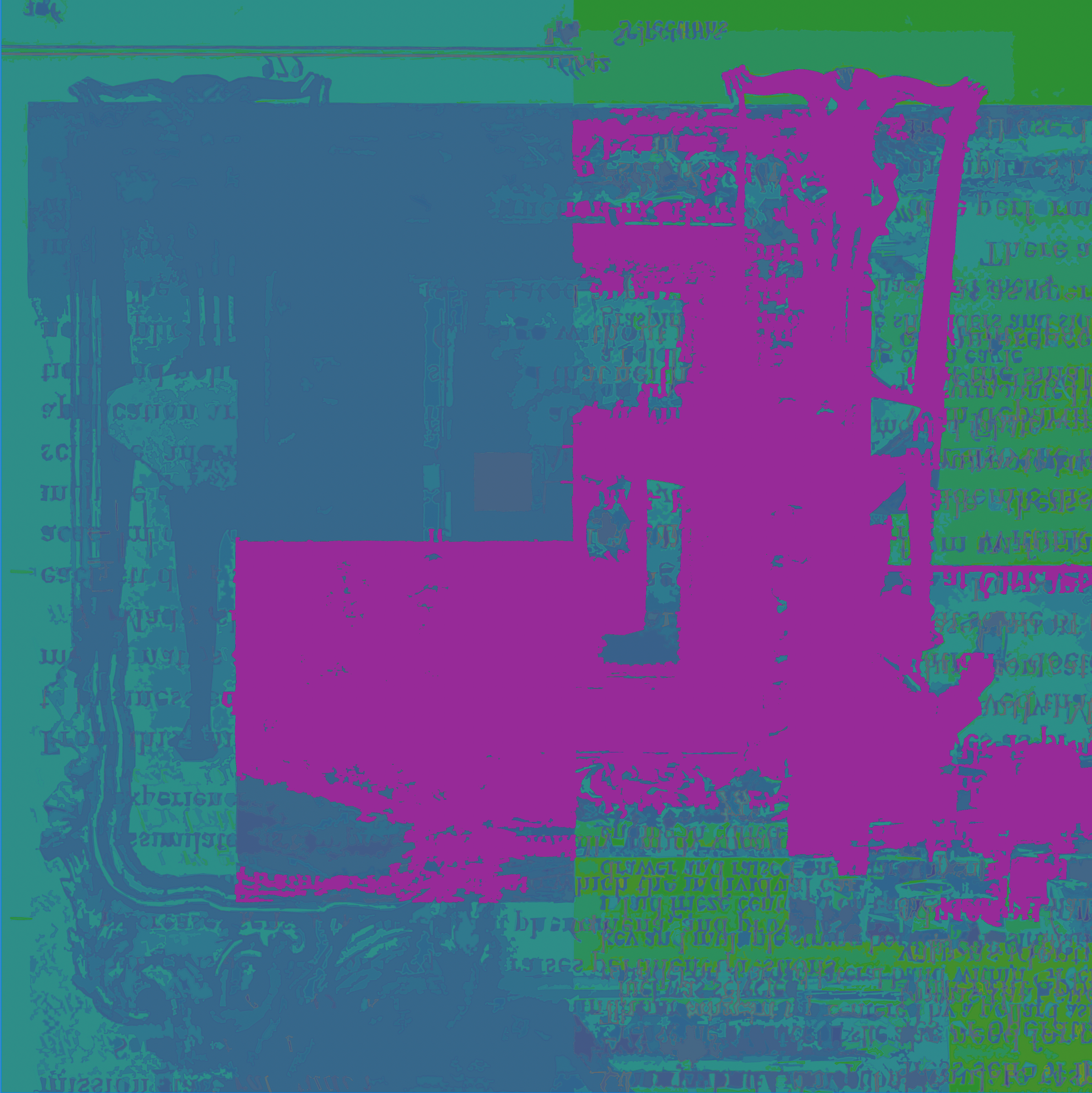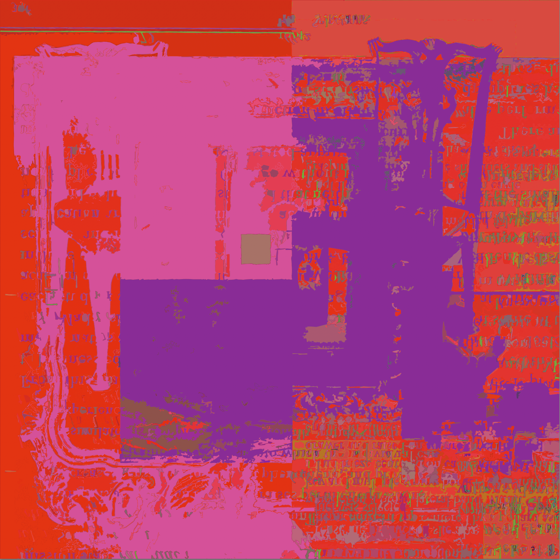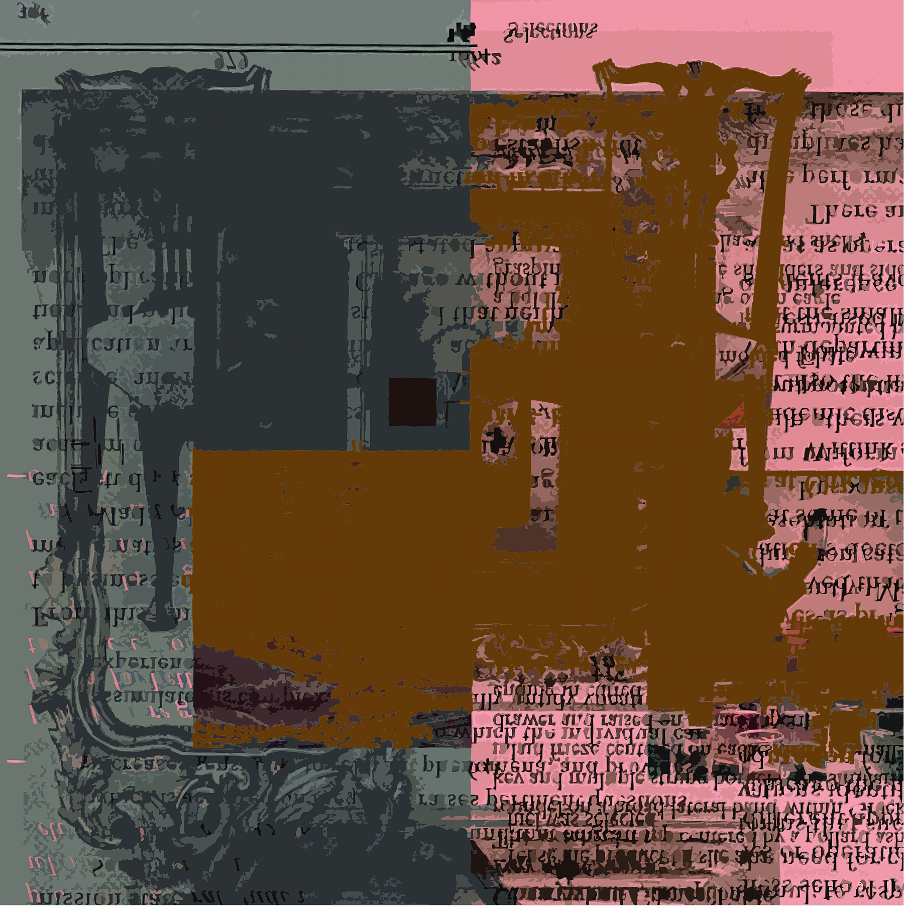 CHAIRS, (MakeReady Series 1) 2019-2023. 28X32. Printed dyes, encaustic, canvas mounted on board. Original, plus 99 digital iteratives. Limited edition of (9) each.